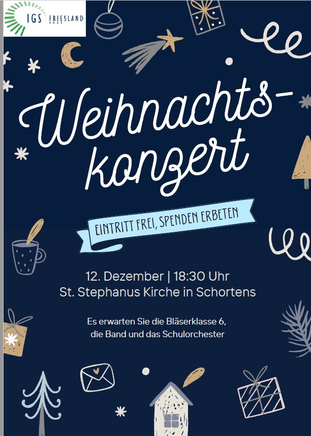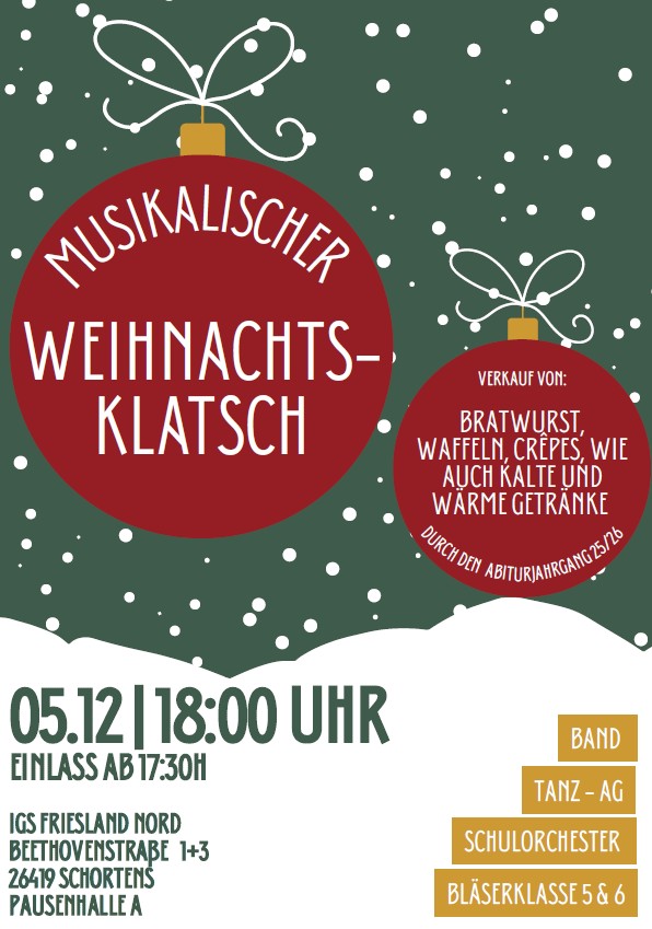 Am Freitag, 5. Dezember um 18.00 Uhr ist es endlich wieder so weit - es findet erneut der musikalische Weihnachtsklatsch in der Pausenhalle A der IGS Friesland Nord statt. Bei diesem präsentieren sich die Tanz-AGs der Schule, die Bläserklassen, das Orchester und die Schulband. Es erwartet Sie und Euch also ein wunderbares und abwechslungsreiches Programm mit weihnachtlicher Musik, passend zur Vorweihnachtszeit. Es werden aber auch Stücke wie beispielsweise „Moana“ aus dem Film Vaiana oder „Music“ von John Miles zu hören sein.